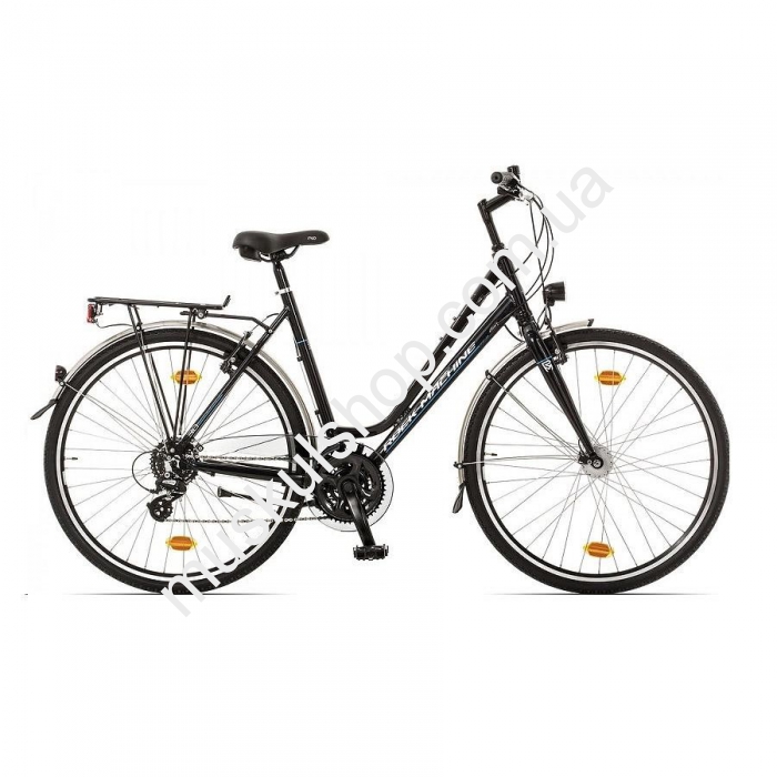 Велосипед RM модель Trekking повышенного комфорта, он комплектуется седлом с пружинной, багажником, подножкой для поддержки велосипеда. В модели предусмотрено 24 передачи. Вилка жесткая, также на велосипеде установлена механическая ободная система резкого торможения, типа V-Brake. Модель 18 дюймовая, выполнена из прочного алюминиевого сплава. Руль изогнутой формы, педали выполнены в классическом стиле. Велосипед городского прогулочного типа, а также способен проходить виражи по песку. Колеса большие, 28 дюймовые, на велосипеде установлены комплектующие от европейских брендов, они превращают обычный велосипед в бойца гоночных улиц.