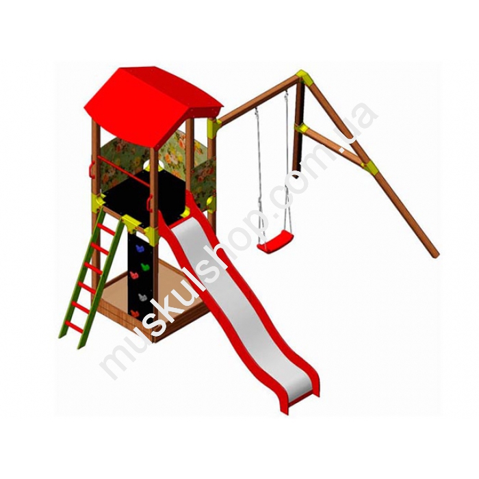 Платформа башни располагается на высоте 1,5 метров от земли; Габариты песочницы - 1,25x1,25 м; В состав модели входят: башенка (корпус), качель и лестница, горка,стенка для лазания, песочница;