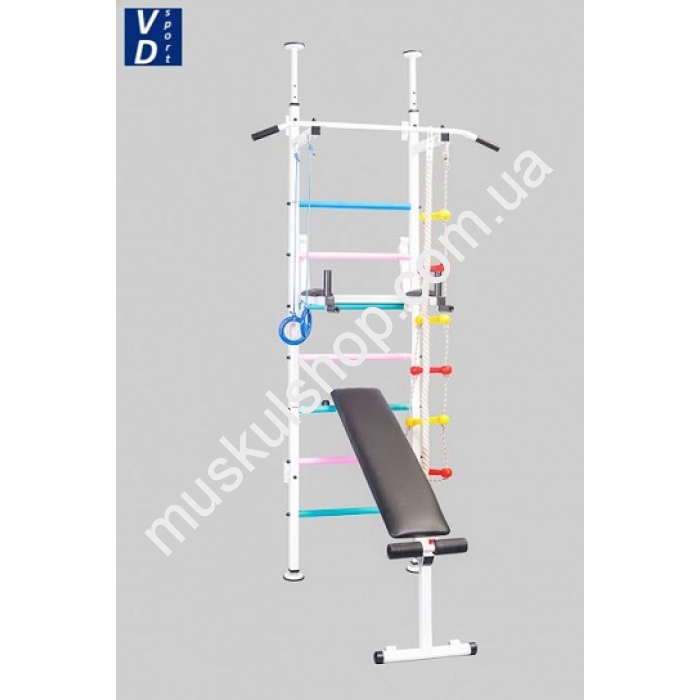 Навесные брусья с креплениями для штанги с мягкой спинкой размещаются на тренажере на желаемой пользователем высоте. В такой конфигурации удобно выполнять отжимания на брусьях, подъем ног (располагая локти на подлокотниках и держась руками за соответствующие пластмассовые ручки). На шведскую стенку устанавливается универсальная скамья для пресса. Устанавливая лавку под разными углами, можно получить различную нагрузку на мышцы пресса. В конструкции лавки предусмотрены пенополиуретановые валики для ног, облегчающие выполнение упражнений. Для малышей и младших школьников предусмотрен детский навесной набор: канат кольца, веревочная лестница.