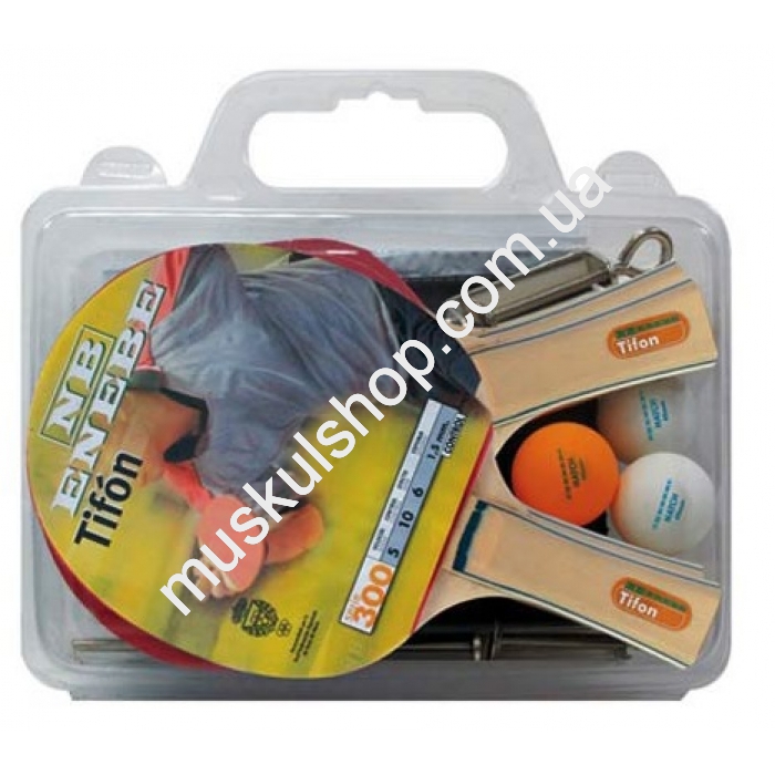 Теннисный набор для 4 игроков Enebe Tifon 888454 - состоит из транспортировочного бокса, 4 отличных любительских ракеток для настольного тенниса Enebe Tifon Serie 300, 3 мячиков и универсальной нейлоновой сетки с крепежом (на закрутках).