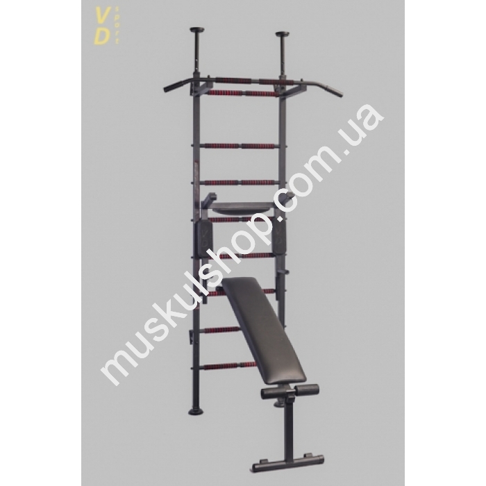Брусья с мягкими подлокотниками из вспененного полиуретана с возможностью выполнения упражнений на нижний пресс (поднятие ног) и с держателями под штангу. Так же добавлена мягкая спинка для удобства тренирующихся.