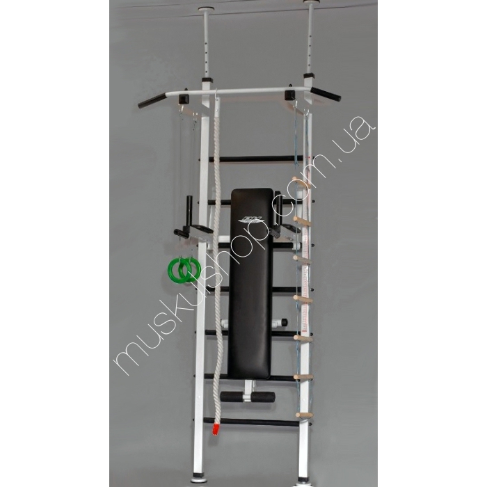 Габариты: Максимальный вес пользователя: 120 кг; Максимальный вес штанги: 90 кг; Высота помещения для установки: минимум 2,2 м для крепления к стене и 2.40 для распора пол-потолок. Максимальная высота: 285 см (при креплении в потолок). Высота до турника: 230 см (минимально 210, максимально 235); Ширина по турнику: 114 см; Вылет турника: 45 см (минимум 45 см, максимум 60 см - с кронштейнами); Полная масса тренажера: 50 кг.
