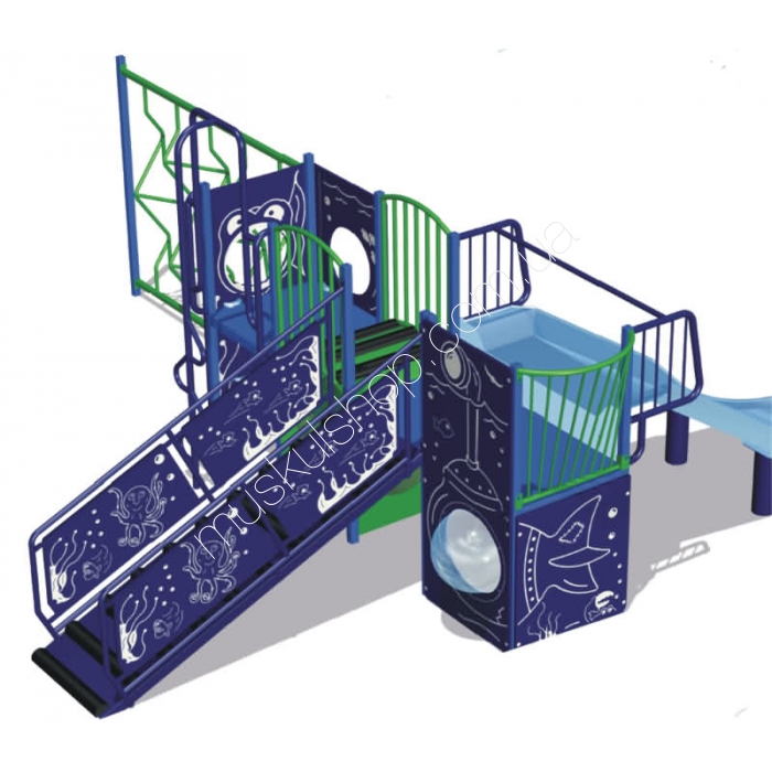 Детский комплекс «Синее море» Данная детская площадка состоит из детской горки, веселых панелей, платформы, подъема для скалолазания и ступенчатого подъема.
