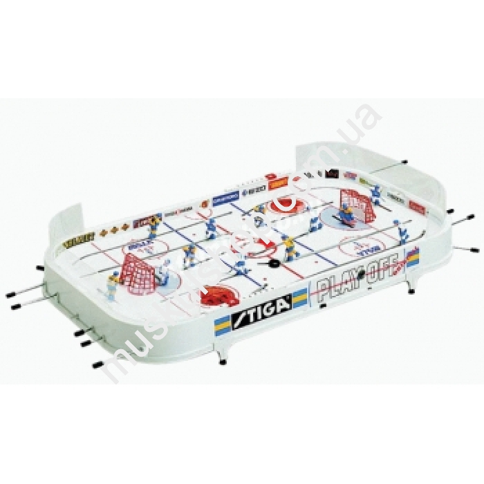 Настольная игра со штампованным ровным полем для интенсивного использования, стабильными ножками, которые приподнимают игру над столом и делают ее устойчивой, объемными игроками с персональными номерами на спинах, устройствами для ведения счета и плексигласовыми защитными ограждениями на лицевых бортах.