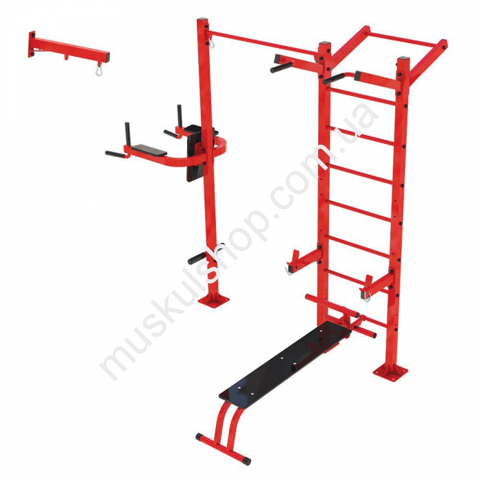 Атлетический комплекс Интер Атлетика УТ102 отличается наличие качели на цепях. Выполнена модель из прочного, качественного стального сплава, общая длина составляет 2,65 м, а высота 2,45 м, способен выдержать нагрузку 130 кг, при этом вес комплекса составляет 135 кг, представлен в красном цвете. Не рекомендованы занятия при снегопаде, дожде и сильном ветре, чтобы нивелировать возникновение травматизма. Отличный комплекс для занятий на свежем воздухе, укрепления общего иммунитета не только ребенка и его здоровья, но и взрослого. На комплексе можно выполнять много различных физических упражнений, он оснащен турником для подтягивания, доской для пресса, которая позволяет качать косые и прямые мышцы брюшного пресса, а также выполнить приседания и жим со штангой, качать бицепсы, голень, укрепить плечевой пояс, спину, руки и шею.