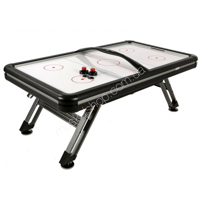 Игровое поле выполнено из ламинированной древесно-стружечной плиты. Стол снабжен мощным компрессором, который нагнетает воздух через отверстия на игровом поле, за счет чего значительно увеличивается скорость полета шайбы. В комплекте 2 шайбы (63 мм - черного цвета), 2 клюшки (95 мм)