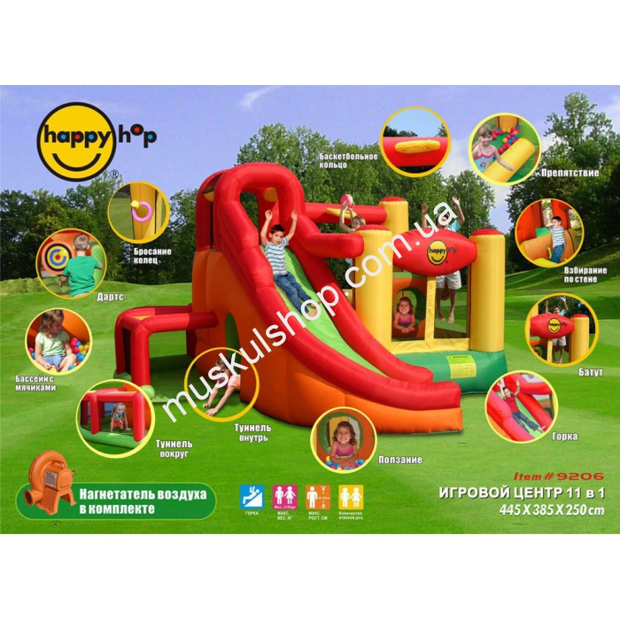 Игровой Happy Hop комплекс включает в себя 11 различных элементов, такие как, бросание колец, батут, игра в дартс, бассейн с шариками, туннель вокруг всего комплекса, туннель внутри, ползание, настоящее баскетбольное кольцо, ползание с препятствиями, карабканье по стенкам и крутой спуск на надувной горке. Дополнительно укомплектован батут нагнетателем воздуха. Детишки оценят игру на комплексе, игры на нем очень полезные, а также способны принести много ярких и положительных эмоций, и заряд бодрого настроения на весь день. Игры укрепляют иммунитет ребенка. Масса комплекса составляет 32 кг, он может вместить сразу 5-х малышей и выдержать 225 кг общей нагрузки на батут.