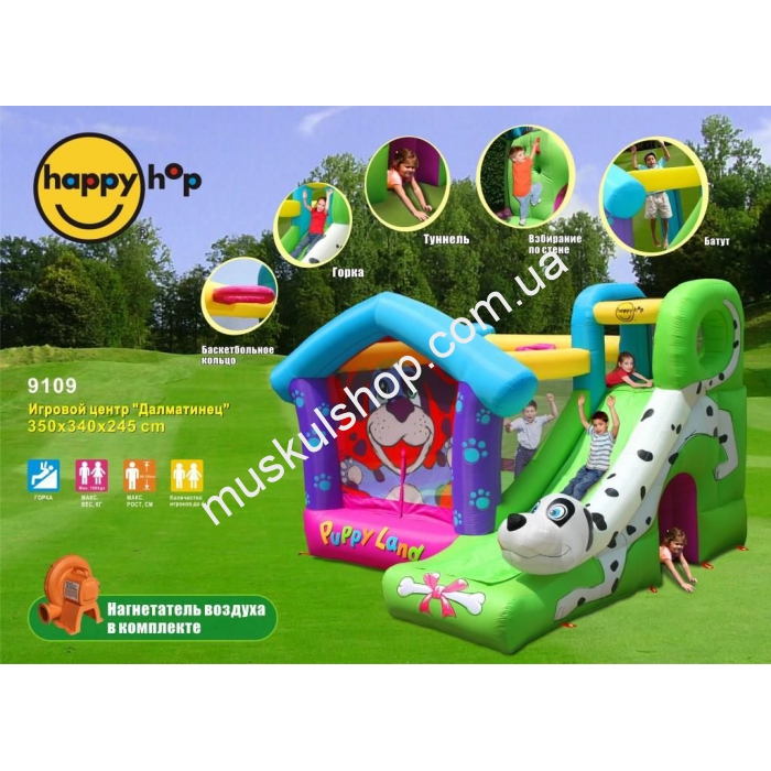 Батут Happy Hop надувного типа, заменит любой игровой центр, он включает в себя: длинный туннель, крутую горку для спуска, батут, прочное баскетбольное кольцо и карабканье по стенам с препятствиями. Комплекс в форме далматинца завораживает своими яркими красками, надувными фигурами и возможностью поиграть на нем. Детишки очень любят игры на батутах, ведь игры на них очень полезные, а также способны принести много ярких и положительных эмоций, и заряд бодрого настроения на весь день. Также игры укрепят иммунитет ребенка. Дополнительно укомплектован батут нагнетателем воздуха. Масса комплекса составляет 30 кг, он может вместить сразу 4-х малышей и выдержать 180 кг общей нагрузки на батут. Батут рекомендован на рост от 90 см до 1,5 м, он изготовлен с качественных и прочных материалов, разноцветный окраски.