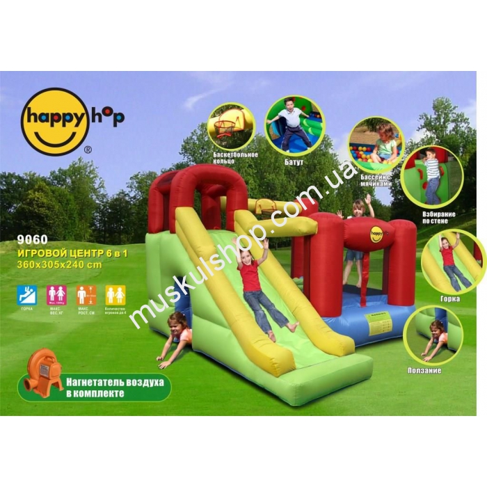 Батут Happy Hop надувного типа, включает в себя громадный комплекс, а именно: надувная горка для спуска, лазанье по стенке, баскетбольное кольцо, бассейн с мягкими мячиками и ползанье. Выполнен батут с антиразрывного материала, разноцветный окраски, способный выдерживать различную амплитуду нагрузок в момент игры, при этом он безопасный и не принесет никакого вреда здоровью детей. Игры на батуте принесут кучу ярких и положительных эмоций, долгие воспоминания и заряд бодрого настроения на весь день. Общий вес данного батута составляет 30 кг, а его характеристики просто впечатляют, он может вместить сразу 4-х малышей и выдержать 180 кг общей нагрузки. Дополнительно комплектуется модель нагнетателем воздуха.