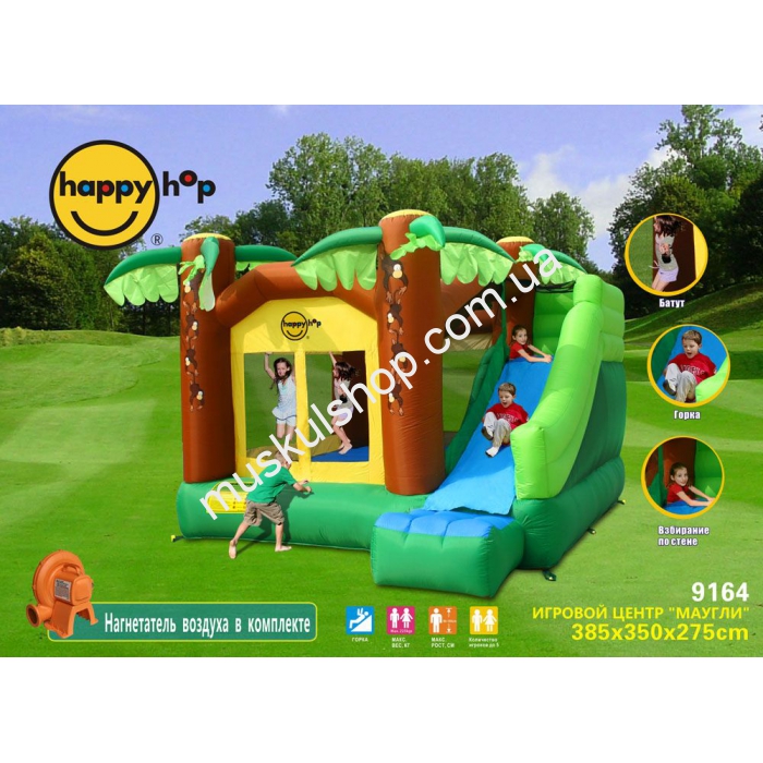 Батут Happy Hop надувного типа, заменит шведскую стенку и кольца, на нем можно карабкаться и спускаться одновременно. Реальный вес батута составляет 35 кг, он может вместить сразу пятерых малышей и выдержать 225 кг общей нагрузки на изделие. Игры на батуте очень полезные, а также принесут много ярких и положительных эмоций, долгие воспоминания и заряд бодрого настроения на весь день. Дополнительно укомплектован батут нагнетателем воздуха и большой горкой для спуска. Выполнен батут с качественных материалов, разноцветный окраски, он способный выдерживать различную амплитуду нагрузок в момент игр. Большая площадь позволит малышам выполнять различные трюки на данном комплексе.