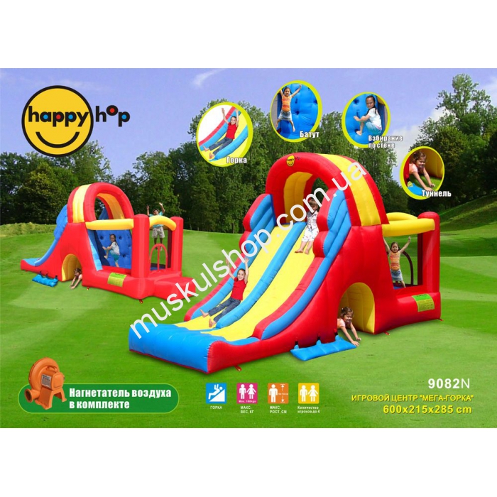 Батут Happy Hop надувного типа, включает в себя громадный комплекс, а именно: надувная горка для спуска, карабканье по стенке и большой туннель. Игры на батуте очень полезные, они принесут кучу ярких и положительных эмоций, долгие воспоминания и заряд бодрого настроения на весь день. Общий вес данного батута составляет 32 кг, а его характеристики просто впечатляют, он может вместить сразу 4-х малышей и выдержать 180 кг общей нагрузки. Дополнительно комплектуется нагнетателем воздуха. Выполнен батут с антиразрывного материала, разноцветный окраски, способный выдерживать различную амплитуду нагрузок в момент игры. Длинная горка подарит детям незабываемый спуск.