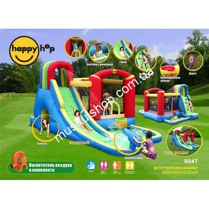 Батут Happy Hop надувного типа, заменит семейный поход в аквапарк. Комплекс «Морские забавы» состоит из широкого тоннеля, батута, надувной горки, баскетбольное кольцо, карабканье по стенке, дартса и бассейна с мячиками. Известно, что все игры на батуте очень полезные, они принесут много ярких и положительных эмоций, долгие воспоминания и заряд бодрого настроения на весь день. Общий вес данного комплекса составляет 29 кг, он может вместить сразу 4-х малышей и выдержать 180 кг общей нагрузки. Дополнительно комплектуется нагнетателем воздуха. Выполнен батут с антиразрывного материала, разноцветный окраски, способный выдерживать различную амплитуду нагрузок в момент игры. Комплекс также наполняется водой.