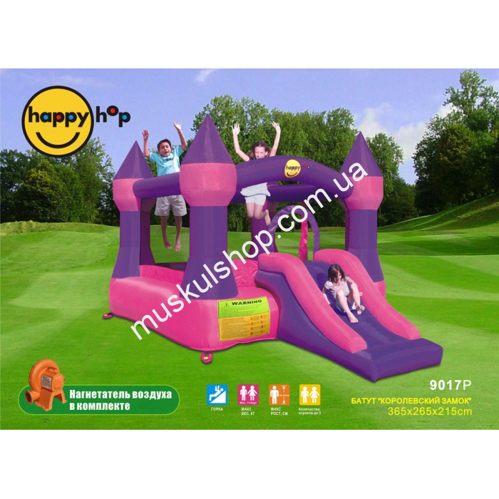 Батут Happy Hop надувного типа, в форме могучего, комфортного и яркого королевского замка займет ваших детишек, принесет кучу положительных эмоций, ярких воспоминаний и просто заряд отличного настроения на весь день, он покорит даже самых ярых непосед. Он способен вместить около 3-х человек, общей массой в пределах 135 кг. Высота батута почти 3 м, а стены, красивые, яркие купола, ярки, сетка завораживают своей красотой. Комплектуется батут нагнетателем воздуха и горкой для спуска. Батут дополнит детскую площадку, базы отдыха, гостиницы, а также парки и детские лагеря. Общий вес батута не превышает 18 кг. Выполнен батут с прочного материала, способный выдерживать резкие прыжки.