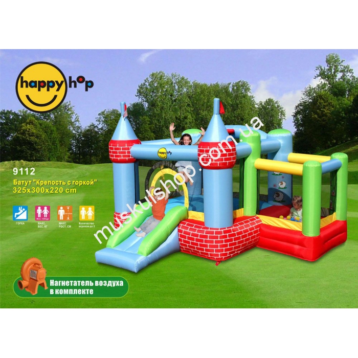 Батут Happy Hop надувного типа, можно наполнить шариками, мягкими игрушками и прочим. Общий вес данного батута не превышает 23 кг, а его общие способности впечатляют, он вмещает до 3-х человек и способен выдержать 135 кг. Выполнен батут с прочного материала, способный выдерживать различную амплитуду нагрузок. Батут очень безопасный, он не принесет вреда здоровью малышей. Батут дополнит городскую детскую площадку, дачу, гостиницы, а также парки и детские лагеря. Он призван принести кучу ярких и положительных эмоций, долгие воспоминания и заряд бодрого настроения на весь день. Комплектуется батут горкой для спуска, арками, защитной сеткой, надежным нагнетателем воздуха и многими другими аксессуарами. Крепость состоит из нескольких царских помещений.