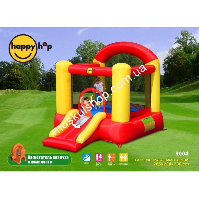 Надувной Happy Hop батут «Попрыгунчик» займет ваших непосед, принесет кучу положительных эмоций, ярких воспоминаний и просто заряд хорошего настроения на целый день. Выполнен батут с прочного материала, способный выдерживать резкие прыжки. Батут сможет принять на свой борт до пяти детишек, идеально подойдет для большой семьи, ведь он может выдерживать до 225 кг общей нагрузки. Масса батута не превышает 13 кг. В целом данная модель представлена в форме боксерского ринга, детишкам на таком снаряде будет не только весело, но и полезно. В батуте предусмотрена также горка для спуска и нагнетатель постоянного воздуха. Габариты надувного батута позволяют вместить его в любом месте, его длина составляет в пределах 3 м, отличное дополнение детской площадки, домов отдыха, гостиниц, а также парков и детских лагерей.