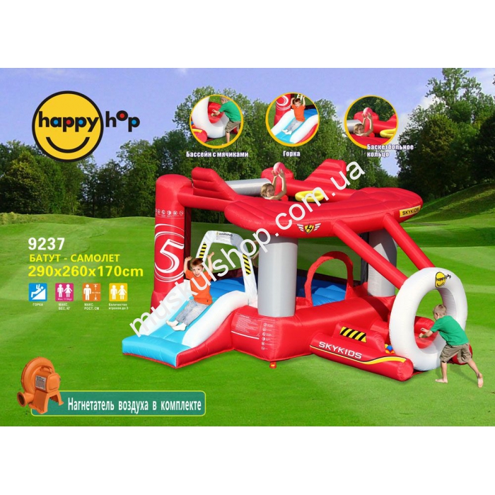 Батут Happy Hop надувного типа, унесет детишек в мир сказок на своем красочном самолете. Он возьмет на свой борт до 3-х человек, модель способна выдержать 135 кг. Выполнен батут с прочного материала, способный выдерживать различную амплитуду нагрузок. Батут очень безопасный, он не принесет вреда здоровью малышей. Батут дополнит городскую детскую площадку, дачу, гостиницы, а также парки и детские лагеря. Общий вес батута не превышает 17 кг, а его общие способности впечатляют, Модель комплектуется надежным нагнетателем воздуха. Он призван принести кучу ярких и положительных эмоций, долгие воспоминания и заряд бодрого настроения на весь день. Комплектуется батут горкой для спуска, арками, защитной сеткой и многим другими аксессуарами.