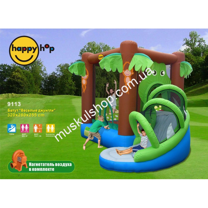 Батут Happy Hop надувного типа, в виде настоящих, знойных и увлекательных джунглей придется по душе абсолютно любому ребенку. В модели продумано все до мельчайших деталей, элегантная горка для спуска, листва, сетка и деревья придают батуту уникальности и элегантности. Комплектуется модель нагнетателем воздуха и многими различными аксессуарами. Игры на батуте принесут море ярких и положительных эмоций, долгие воспоминания и заряд бодрого настроения на весь день. Общий вес данного батута составляет 27 кг, а его характеристики впечатляют, он способен вместить около 3-х малышей и выдержать 135 кг общей нагрузки. Выполнен батут с прочного материала, разноцветный раскраски, способный выдерживать различную амплитуду нагрузок в момент игры. Батут безопасный, он не принесет никакого вреда здоровью детей.