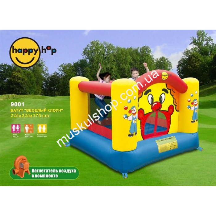 Надувной Happy Hop батут «Веселый Клоун» выполнен в форме боксерского ринга, детишкам на таком снаряде будет не только весело, но и полезно. Габариты надувного батута позволяют вместить его в любом месте, его длина составляет всего 3 м, а ширина с высотой не превышает 2 м, отличное дополнение детской площадки, домов отдыха, гостиниц, а также парков и детских лагерей. Комплектуется батут нагнетателем воздуха. Батут выдерживает свыше 90 кг общего весе, при этом его вес равен только 15 кг. Выполнен батут с прочного материала, способный выдерживать резкие прыжки. Изделие подарит кучу положительных, ярких эмоций вашим деткам. Батут сможет принять на свой борт не более двух детей.