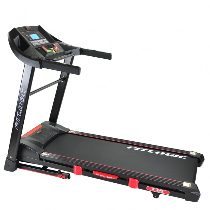 FitLogicБеговая дорожка FitLogic T15Беговая дорожка FitLogic T15 разработана для активных занятий бегом в домашних условиях. Предусмотрена кнопка аварийной остановки и быстрого старта. Установленная система амортизация гарантирует бесшумные упражнения, отсутствие вибраций, шумов и скрежета, можно ставить тренажер на балконе и смело тренироваться. На 5 оконный стильный дисплей выводится информация о количестве сожженных калорий, реальной скорости, времени, пройденной дистанции и уровне сердцебиения. Тренажер для домашних тренировок ФитЛогик T15 обладает симпатичным дизайном, встроенными динамиками, специальным разъемом для подключения мр3 устройства. Сенсорные датчики, которые установлены в рукоятки, измеряют пульс. Для облегчения складывания и раскладывания дорожки предусмотрен специальный цилиндр. Рамная конструкция выдерживает 120 кг нагрузку пользователя.