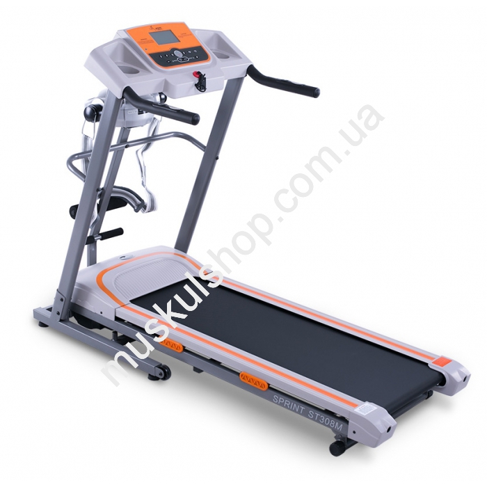 Sprint AquaticsБеговая дорожка Sprint ST308MБеговая дорожка Sprint ST 308 M с вибромассажером подойдет для нескольких членов семьи, и как кардиотренажер и как тренажер коррекции фигуры. Мощная и надежная, стильная и компактная, она идеально впишется в любой дизайн. Мощность: 2 л.с. (пиковая мощность: 3,5 л.с.) Скорость от: 1-16 км/час Угол наклона: 3 позиции Тип полотна: двойное полотно Толщина бегового полотна: 1,6 мм Амортизационная система: SoftDeck уникальная 4-х точечная система поглощения ударов (4 силиконовых амортизатора «сота», заменяющие 8 обычных эластомеров). Транспортировочные ролики: есть Тип рамы: складывается Консоль