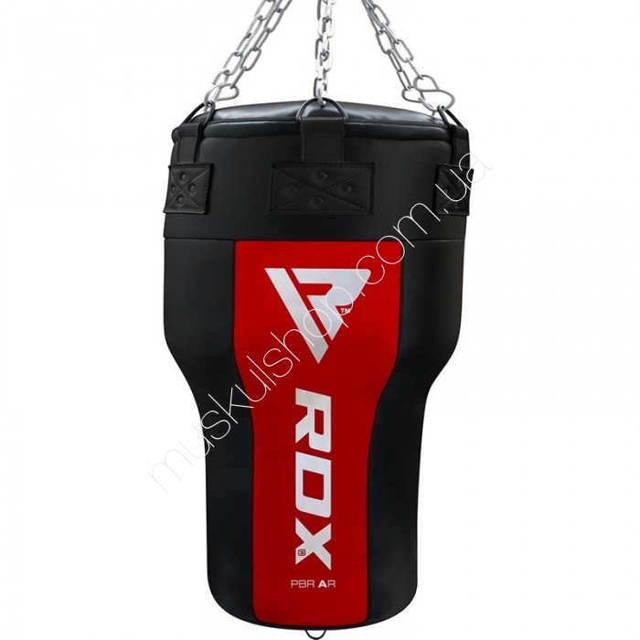 RDXБоксерский мешок конусный RDX Red New 1.1м 50-60кгКонусный боксерский мешок еще называют «гильза». Он необходим для отработки апперкотов, боковых и прямых ударов в голову. Конусообразная верхняя плоскость и цилиндрическая нижняя – это ударные поверхности. Боксерские мешки (конусные) RDX предназначены для профессиональных спортсменов и спортивных клубов с высоким уровнем тренировочной нагрузки. Эти мешки зарекомендовали себя как наиболее долговечные, функциональные и надежные. Конусный боксерский мешок RDX выполнен из высокопрочной кожи Maya. Набивка: текстиль, ветошь, коттон, джинс, гелевая прослойка на внешней части. Внизу есть дополнительное кольцо и 6 колец для крепления цепи.