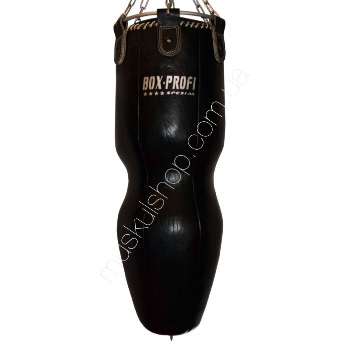 Универсальный мешок для бокса, полностью соответствует силуэту человека, поможет отработать различные удары, под особыми углами и наклонами. Внизу мешка размещено стальное кольцо для резинового шнура. Универсальный мешок подходит также каратистам, кикбоксерам и другим бойцам восточных единоборств, для нанесения ударов ногами. Длина мешка 110 см, а ширина 45 см, представлен в черном цвете, фирменного стиля, общей массой 60 кг. Швы мешка с двойной прошивкой, это поможет продлить срок. Крепится мешок благодаря стальным 8 мм цепям и прочному карабину, толщиной в 14 мм. Набивка способна выдерживать мощные удары, не терять при этом свою форму. Наполнитель мешка текстильный материал, пошит с цельной, качественной и эластичной кожи, толщиной около 6 мм.