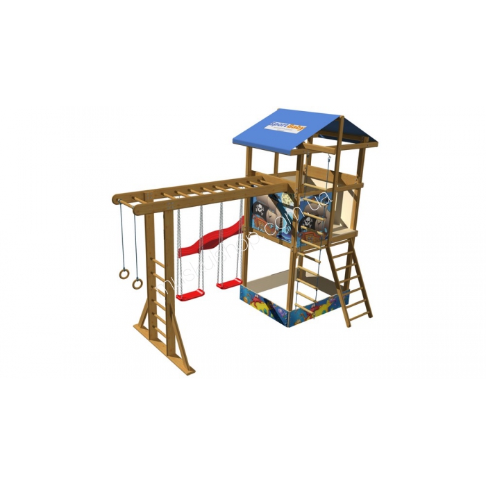 Детская площадка Sportbaby-14 комплектуется рукоходом, качелями, башней с песочницей, горкой для спуска, кольцами для упражнений, лестницей из веревок. Такой комплекс может выдерживать свыше 80 кг веса малышей. Площадка состоит из нескольких лестниц, позволяя малышам устроить небольшие соревнования. Конструкция из сосны, пропитанная специальным средством, нет острых углов и тяжелого металлического крепления, а также химических веществ, а горка покрыта качественной водоэмульсионной краской. Тут детишки не только займутся делом, но и укрепят свой иммунитет. Такая деревянная площадка идеально подойдет для загородных домов и дач. Играть на такой площадке могут сразу несколько непосед, рассчитана модель на большую семью.