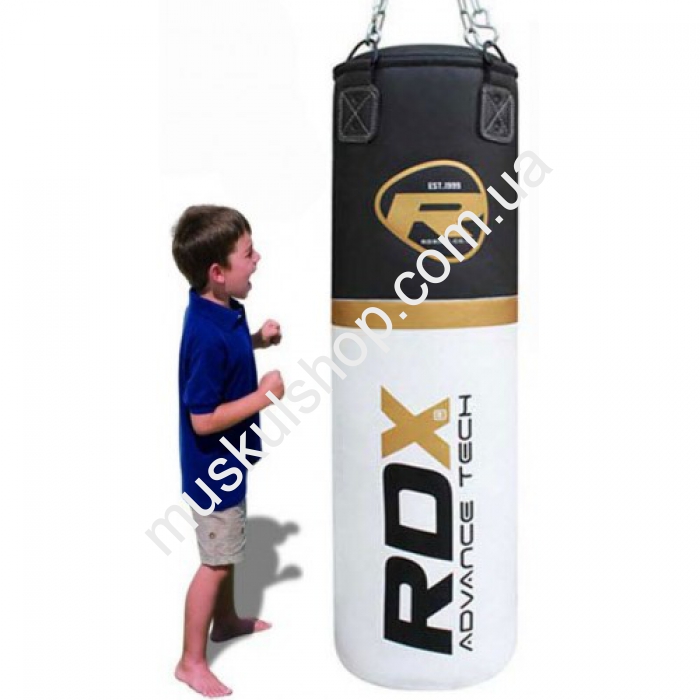 Детский RDX боксерский мешок предназначен для отработки детских ударов, тут ребенок может почувствовать себя настоящим боксером. Крепится спортивный снаряд при помощи колец, для более прочной фиксации предусмотрено также кольцо внизу мешка. Пошит мешок ручным методом из прочной и надежной кожи типа Мауа. Длина мешка составляет 1,2 м, масса регулируется застежкой от 20 до 25 кг, а диаметр снаряда не превышает 30 см. Швы очень прочные, не разрываются в момент нанесение удара. На данном типе груш ребенок сможет поразминать мышцы рук, ног, укрепит свои кисти рук, плечевой зоны, и тут же поймет, что он маленький, однако защитник своей семьи. Мешок представлен в благородном золотом оттенке, полностью соответствует всем международным нормам бокса.