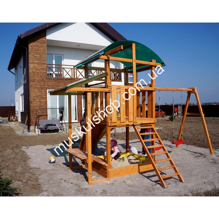 Детский игровой комплекс Sportbaby Babyland-7 внесет яркие краски в досуг ваших непосед. Комплекс изготовлен из сосны, общей массой 250 кг, цвета натурального дерева. Изделие обработано антисептиком, который не вызывает аллергических реакций. Комплекс способен выдерживать достаточно большой вес. В него входит: песочница, стол, лавочки, качели, горка для маленького скалолаза, а также детская горка. Даже спустя пару лет частой эксплуатации, такой детский комплекс абсолютно не изменит первоначальный облик. Дачный комплекс полностью безопасный, имеет различные сертификаты качества. Комплекс не требует больших площадей под свое размещение.