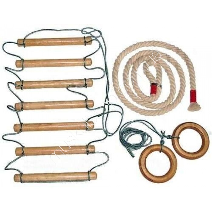 ЛадасДетский навесной набор ЛадасДетский навесной набор Ладас идеальное дополнение, которое подходит для применения вместе со шведской стенкой, или с детским спортивным уголком. Именно этот комплекс способен разнообразить спортивный досуг вашего ребенка, позволяя ему выполнять разнообразные упражнения и просто развлекаться. Такой набор состоит не только из высококачественной и прочной породы дерева, но и с применением прочных волокон ткани, которые применяются для каната и веревочной лестницы. Детский навесной набор Ладас состоит из каната, по которому могут взбираться дети, веревочной лестницы и гимнастических колец. Каждое комплектующее представленного набора легко крепится и может быть так же легко снято. Но во время использования данного комплекта вашими детьми, его элементы не будут обрываться.
