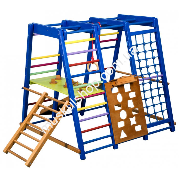 Детский спортивный комплекс SportBaby Акварелька мини обладает современным и красочным дизайном, который придётся по вкусу как девочкам, так и мальчикам. Спортивные атрибуты, которые присутствуют в данном комплексе, поспособствуют всестороннему развитию маленького пользователя. Самым приятным сюрпризом для малыша, наверняка, станет небольшая горка. Плюсом данного комплекса можно назвать то, что его можно устанавливать в помещении, для которого он, фактически, и предназначается. Стоит также упомянуть о том, что весь комплекс создан из высококачественной и прочной породы дерева.