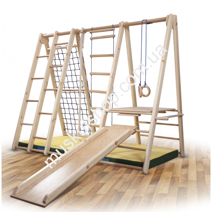 Детский спортуголок Sportbaby Малютка-3 самый лучший в своем линейном ряде, завоевал большую популярность среди детишек и взрослых. Комплекс начинают применять с пятимесячного возраста малыша, цепляя его за стенку, перекладину и кольца. Устанавливать такой комплекс можно в любом месте, большое пространство он не украдет. Комплекс выдерживает нагрузку свыше 150 кг, при этом масса самого изделия не превышает 40 кг. Все детали выполнены из прочного бука и сосны, пропитанные специальным антисептиком, представлен комплекс в цвете натурального дерева. Кроме всего перечисленного он весьма прочный, надежный. Позвольте детворе весело провести время, купите спортивный уголок!