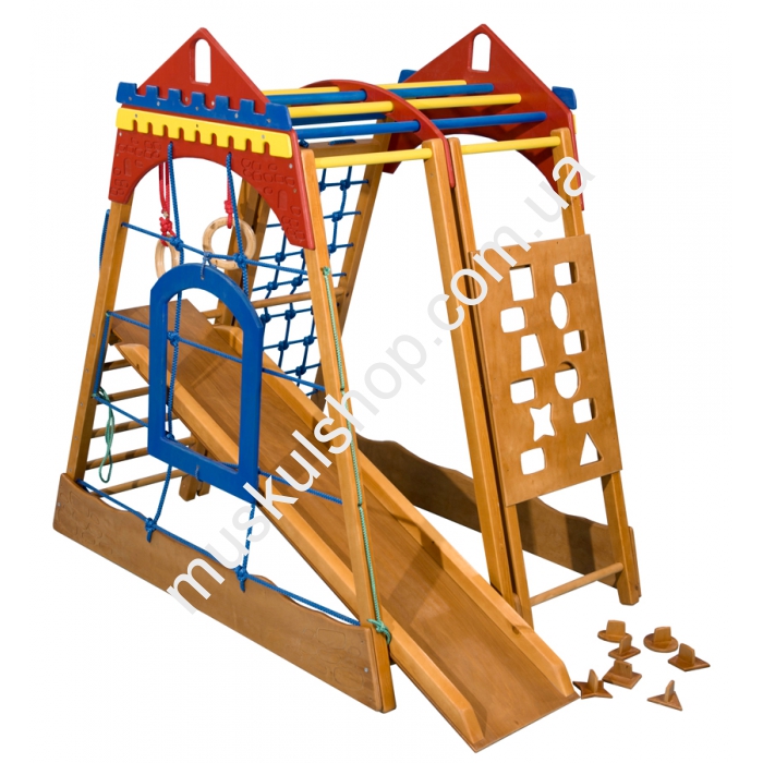 Детский спортивный уголок SportBaby Замок мини обладает современным и красочным дизайном, который придётся по вкусу как девочкам, так и мальчикам. Спортивные атрибуты, которые присутствуют в данном комплексе, поспособствуют всестороннему развитию маленького пользователя. Самым приятным сюрпризом для малыша, наверняка, станет небольшая горка. Плюсом данного комплекса можно назвать то, что его можно устанавливать в помещении, для которого он, фактически, и предназначается. Стоит также упомянуть о том, что весь комплекс создан из высококачественной и прочной породы дерева.