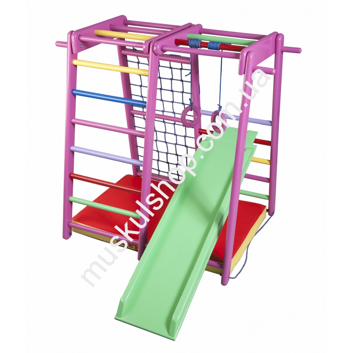 Детский спортуголок Sportbaby Кроха-2 Барби настоящий миниатюрный спортзал, в нем все предусмотрено от шведской стенки до гладиаторской сетки, а также кольца, мат для выполнения различных упражнений, горка для спуска и кольца. Уголок выполнен из сосны и бука, представлен в цветном оттенке. Комплекс хорошо развивает руки малышей, укрепляет их мышцы, а также поднимает иммунитет и выносливость. Комплекс выдерживает нагрузку до 80 кг, при этом масса самого изделия не превышает 40 кг. Даже малыш в возрасте одного года будет на таком комплексе творить невозможное. В производстве комплекса применялись только экологически чистые материалы. Конструкция очень устойчива и безопасная.