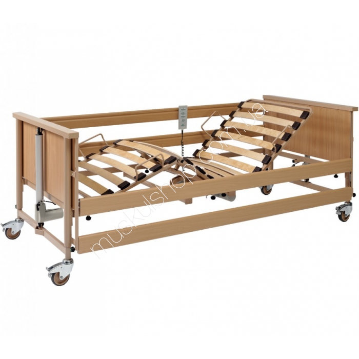 Функциональная кровать, производства торговой марки Burmeier, с электрической регулировкой удобна и практична для использования, как в домашних условиях, так и в медицинских учреждениях. Предназначена для лежачих больных, пациентов стационара, инвалидов, пожилых людей. Четырехсекционная кровать на колёсах с электроприводом, фиксаторами для матраса, деревянными спинками (изготовлены из ламинированной ДСП) и поручнями. Поверхность ложа деревянная, ламели из металла, поручни с имитацией под бук. Металлические детали покрыты методом порошкового напыления. Материалы безопасны для кожи. Поверхность ложа делится на четыре секции: 3 подвижные секции (голова-таз, таз-колено, колено-пятка) и одна статичная (таз-бедро). Регулируется по высоте и углу наклона относительно пола. Угол наклона спинной секции составляет - 70°, угол наклона тазобедренной секции - 35°, а угол наклона матрасной рамы - 10°. Высота ложа над полом составляет - 40-80 см. Регулировка осуществляется с помощью пульта дистанционного управления, с возможностью независимой блокировки отдельных клавиш. Длинный кабель обеспечивает удобное пользование пультом с любой стороны кровати. Регулируемые секции позволяют пользователю занять удобное лежачее или сидячее положение. Правильная посадка повышает эффективность лечения и реабилитации в послеоперационный период. У функциональной кровати прочная конструкция, изготовлена из металлических окрашенных профилей. Максимальная нагрузка - 185 кг. Производитель электропривода - Linak (Дания). Бесшумный мотор не нарушает покой и сон пациента, во время поднятия и опускания кровати. Деревянные подвижные поручни - складного принципа (легко поднимаются и опускаются; с индивидуальной блокировкой). Они служат для безопасности пациента, защищают пользователя от случайного падения с кровати во время сна. Диаметр колёс - 100 мм. Каждое колесо оснащено индивидуальным тормозом, что позволяет свободно перемещать кровать в помещении. В комплекте с кроватью предусмотрена опорная (травматологическая) дуга и опускаемые боковые поручни с обеих сторон кровати. Дуга устанавливается у изголовья лежачего пациента (у изголовья есть специальные карманы). Опорная ручка может регулироваться по высоте. Комплектация используется в качестве дополнительной опоры, помогая при необходимости изменить положение в постели, не прибегая при этом к посторонней помощи. Угол подъема головной секции: 70°. Угол подъема ножной секции: 35°. Доставка за счет покупателя.