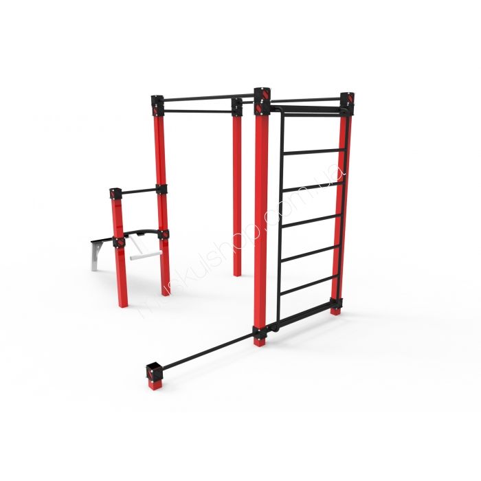 Состоит из шести вертикальных опорных столбов, перекладин, скамьи для пресса, упора для отжима и шведской стенки.