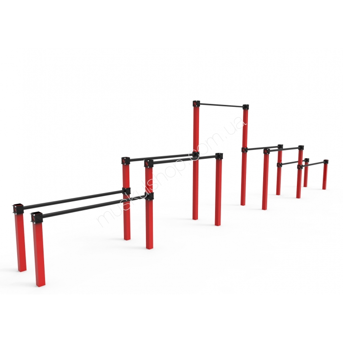 Комплекс состоит из 12 вертикальных опорных столбов, 1 перекладин и 8 брусов для занятий спортом.