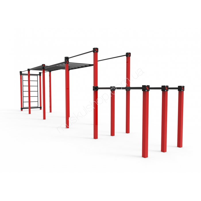 Состоит из 14-ти вертикальных опорных столбов, перекладин, рукохода, брусьев и шведской стенки.