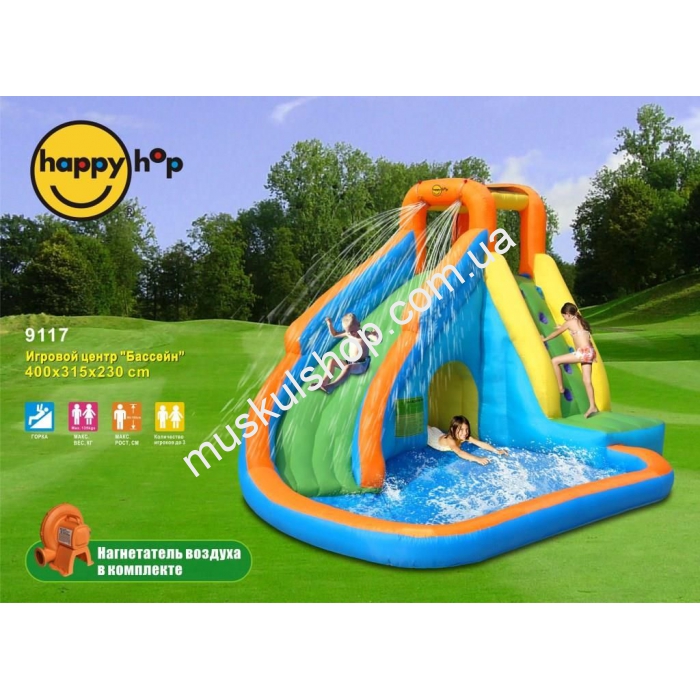 Батут Happy Hop надувного типа, представляет собой целый водный комплекс с водяной пушкой, батутом и высокоскоростной горкой, а также комплектуется нагнетателем воздуха и многими различными аксессуарами. Он призван принести кучу ярких и положительных эмоций, долгие воспоминания и заряд бодрого настроения на весь день. Выполнен батут с прочного материала, разноцветный, способный выдерживать различную амплитуду нагрузок в момент игры. Батут безопасный, он не принесет никакого вреда здоровью малышей. Данная модель дополнит любую городскую детскую площадку, дачу, парк. Общий вес данного батута составляет 24 кг, а его общие способности впечатляют, он способен вместить около 3-х малышей и выдержать более 130 кг общей нагрузки. Идеально подойдет для летних забав.