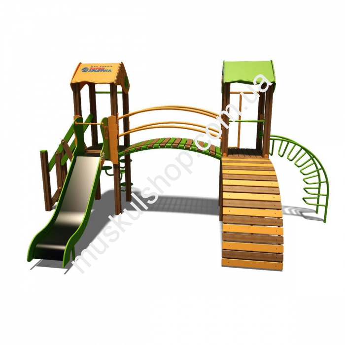 Игровой комплекс Гномик-NEW Интер Атлетика T802NEW представлен в форме двух домиков, соединенных между собой трапом с перилами. Комплекс оснащен горкой для крутого спуска, лестницей с перилами, несколькими гнутыми лестницами и винтовой лестницей. Безупречный комплекс для игр на свежем воздухе, укрепления общего иммунитета ребенка и его здоровья. Его устанавливают на детских площадках, на дачах, игровых площадках, базах отдыха и школах. Категорически запрещена игра при снегопаде, дожде и сильном ветре, чтобы нивелировать возникновение травматизма, необходимо держаться в момент игры за поручни. Выполнена модель из прочного, отборного и качественного сорта дерева, с применением пластика и прочной стали, общая длина составляет 3,44 м, а высота 3,08 м, рассчитан на детишек от 3 до 6 лет, способен выдержать нагрузку 80 кг на 1 посетителя. Выполнена модель в нескольких цветовых гаммах, желто-голубой, оранжево-зеленый, желто-красный.