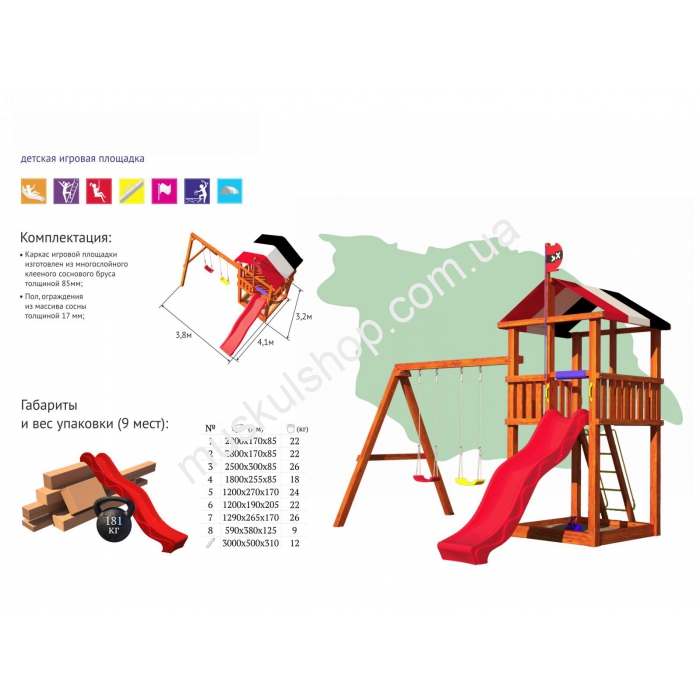 Детский игровой комплекс Sportbaby Babyland-2 выполнен из сосны, общий вес комплекса в целом не превышает 200 кг. В комплекс входят качели, детская горка и большая песочница. Комплекс способен выдерживать достаточно большой вес. Сосна может выдерживать любые динамические физические нагрузки и при этом не менять физические свойства. Даже спустя пару лет частой эксплуатации, такой детский комплекс абсолютно не изменит первоначальный облик. Комплекс имеет различные сертификаты качества. Сосна пропитана антисептической добавкой, не пропускающей влагу, а также блокируя гниль и развития различных бактерий в дереве. Комплекс не занимает много места и может разместится в любом дворе.