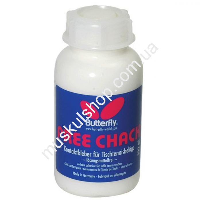 Клей Butterfly выполнен с настоящего каучука. Прочно держит накладку, не отклеивается, быстро сохнет. При надобности накладку можно с легкостью снять, а также удалить остатки каучука с основания профессиональной ракетки. В составе клея отсутствуют органические материалы и растворители, ободрен и аккредитован международной теннисной федерацией. В комплекте поставляются также поролоновые тампоны, для нанесения клея на основании ракетки и непосредственно накладки. Клей белого цвета, объем флакона 500 мл. Клей станет незаменимым помощником на ответственных матчах, когда игроку необходимо играть сразу в нескольких зонах стола, меняя накладки и основания.