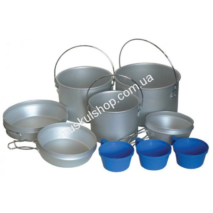 Посудный Tramp набор оснащен сразу тремя котелками на 1,2, 1,9 и 2,9 литра с круглыми ручками для подвешивания и крышками-сковородками со складным типом ручек. Посуда поможет приготовить плов, юшку с рыбы и прочие шикарные блюда на природе, посуда выполнена с износостойкого, алюминия полностью защищает изделие от коррозии. Толстые стенки посуды обеспечат длительный срок эксплуатации, дополнительно предусмотрено три пластмассовых кружки для бульонов либо чая. Данный набор поможет, сполна насладится средним и большим компаниям безупречным отдыхом на природе, сварить уху либо вкусную юшку из подстреленной дичи, пойманной рыбы, а также сварить вкусный компот из лесных ягод.
