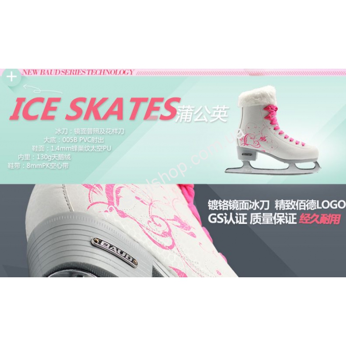 Коньки Baud бело-розового цвета, утепленные, подкладка из качественного меха, рассчитаны на женщин. Верх данной модели коньков пошит из прочного, водонепроницаемого нейлона, а подошва из экологической, натуральной и эластичной кожи. Лезвие выполнено из нержавеющей стали, а основа коньков из серого цвета. Подошва коньков пошита из прочной, эластичной и качественной кожи. Фиксируются данная модель коньков благодаря прочным шнуркам, в наличие несколько размеров, можно выбрать на заказ любой. Данная модель применяется в фигурном катании при показательных выступлениях и различных турнирах. Вес коньков не превышает 1 кг, очень маневренные, прочные и многофункциональные.