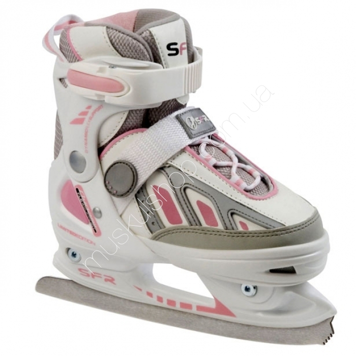 SFRКоньки по льду SFR Softboot Ice Skate SFR075pКоньки по льду SFR Softboot Ice Skate SFR075p отличаются тем, что были созданы из качественных материалов, которые могут выдержать длительную эксплуатацию при учёте низких температур. Покрытие на лезвии способствует тому, что сталь не поддаётся воздействию холода и влаги, а потому на ней не появляется коррозия. Ботинок данного оборудования весьма удобный и надёжный, он не только не соскальзывает с ног пользователя во время катания, но и не сдавливает их. Нержавеющая сталь, которая использовалась для создания лезвий для коньков, не только позволяет долгое время сохранять им изначальный вид, но и не терять заточки. Коньки по льду СФР Софтбуут Айс Скейт СФР075п по своему внешнему дизайну похожи на ролики, но только отличаются плотностью внешнего материала и наличием лезвия вместо колёсиков. Коньки совершенно не мешают движению пользователя, обеспечивая плавное и комфортное катание по льду.