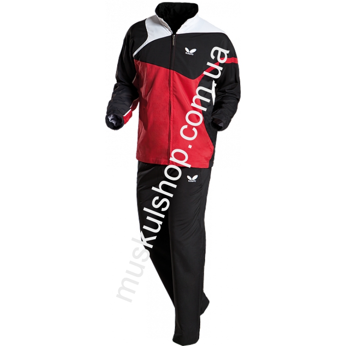 Костюм Butterfly теннисный выводит влагу наружу, можно использовать в обыденной жизни. Брюки в данной модели черного цвета, на них нанесен логотип фирменного бренда. Костюм черного цвета, подходит всем спортсменам, имеет яркий дизайн и красочный стиль. Отличается модель большой функциональностью, с длинными рукавами, можно играть как в помещениях, так и за его пределами. Выполнен костюм из прочного, эластичного, качественного и надежного полиэстера, куртка фирменного цвета. На куртке находится несколько глубоких карманов, для теннисных шариков, которые прочно запираются молнией. Штаны регулируются по ширине. Спортивный костюм теплый, на него нанесен логотип фирменного бренда.