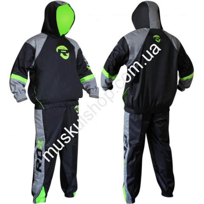 Костюм RDX оказывает антицеллюлитный эффект, выполнен в зеленом цвете, комплектуется капюшоном. Его дизайн подойдет женщинам, мужчинам и даже подросткам, он изготовлен из нейлона, мягкого на ощупь, благодаря чему удерживается тепло. Костюм поможет вам достичь желаемых вершин в спорте, увеличить динамику мышц. Костюм с капюшоном увеличивает скорость похудения, более чем на 70 % увеличивает интенсивность потоотделения во время тренировок. Костюм хорошо поддается стирке, легко чистится, рекомендовано простирывать при низких температурах. Повысить эффект сауны помогают манжеты на ноге и руке и универсальный пояс на талии спортсмена.