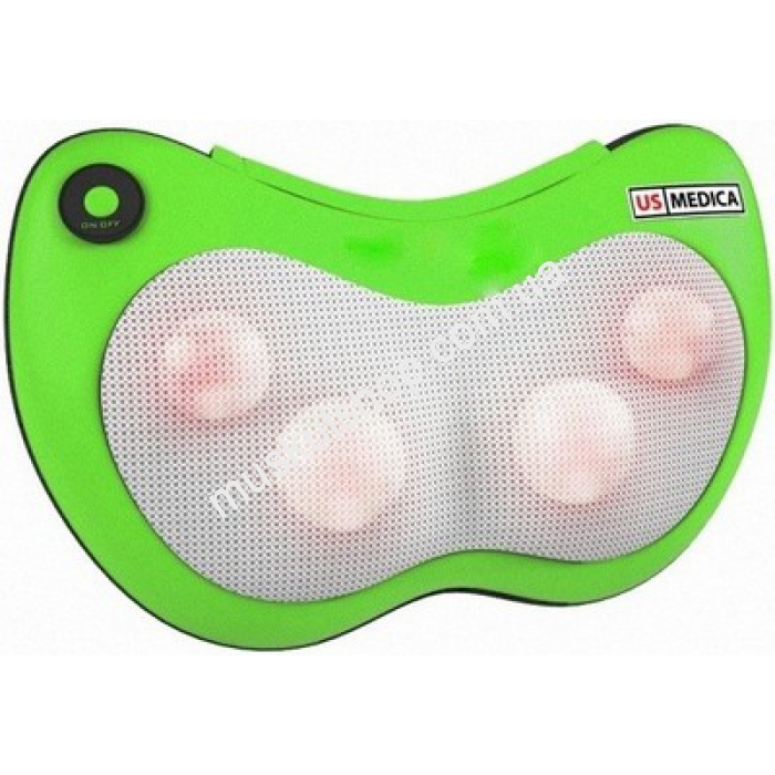 US Medica Apple SMP-70 шикарная массажная подушка зеленого цвета. Система работы: роликовый механизм, всего 4 шт. Применяют при улучшении кровообращения, повышении тонуса, укрепление шейной группы мышц, снятие усталости и стрессов. Широко применяют в домашних условиях, офисе и автомобиле. Вес подушки всего лишь 1,1 кг, а потребляемая мощность менее 30 Ватт. Подушка полностью имитирует руки массажистов, также предусмотрена функция прогрева. Работает от электрической сети либо автомобильного прикуривателя. Данная модель подойдет людям, которые часами сидят за компьютером, за рулем автомобиля либо вынуждены большее количество своего времени проводить в командировках.