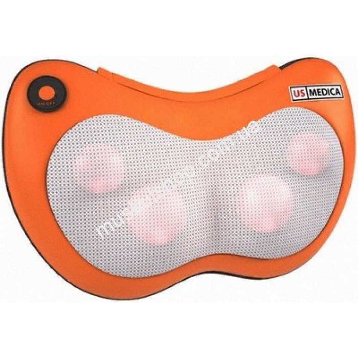 US Medica Apple SMP-70 подушка ярко оранжевого цвета, оснащена кнопкой включения и выключения массажа, система работы подушки: роликовый механизм из 4 роликов. Широко применяют в домашних условиях, офисе и автомобиле. Вес подушки всего лишь 1,1 кг, а потребляемая мощность менее 30 Ватт. Подушка полностью имитирует руки массажистов, также предусмотрена функция прогрева. Работает от электрической сети либо автомобильного прикуривателя. Данная модель подойдет людям, которые часами сидят за компьютером и за рулем. Применяют при улучшении кровообращения, повышении тонуса, укрепление шейной группы мышц, снятие усталости и стрессов.