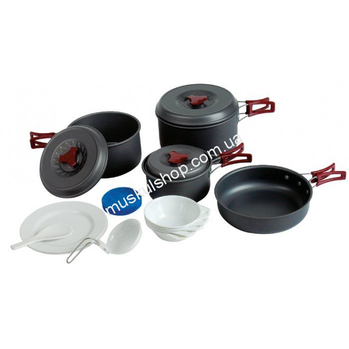 Посудный Tramp набор рассчитан на пять персон, отличается наличием семи глубоких тарелок и трех котелков для приготовления еды на 1, 1,8 и 2,8 литра. Данный набор поможет, сполна насладится средним и большим компаниям безупречным отдыхом, приготовить плов, юшку с рыбы и прочие шикарные блюда на природе. Набор выполнен с износостойкого, анодированного алюминия полностью защищает изделие от коррозии, общим весом 1,4 кг, а толстые стенки посуды обеспечат длительный срок эксплуатации. Дополнительно набор укомплектован 18 см сковородкой для приготовления вкусной заправки к блюдам, суповой ложкой и поварешкой, представлен в сером цвете.